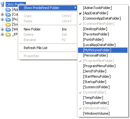 1. In the Citrix Profile tree, select the Citrix Profile node (or any of the files or folders that are listed, point to Show Predefined Folder . A list of predefined folders opens.