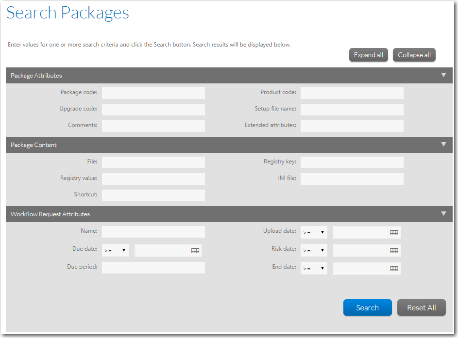 .inifiles, or shortcuts contained in the package. See Package Content. - Workflow Request Attributes—Search by information related to a package’s associated workflow request. See Workflow Request Attributes.