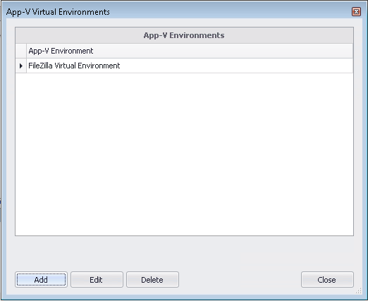 On the App-V Virtual Environments dialog box, which is opened by clicking the App-V Virtual Environment button in the Application Manager ribbon, existing App-V virtual environments are listed. From this dialog box you can add a new virtual environment or edit an existing one.