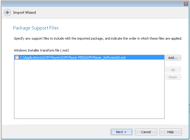 | Windows Installer (.msi) | Transform files (.mst) | All of the \.mst files that are in the same directory as the Windows Installer file you are importing are automatically listed, but only those \.mst files that AdminStudio determines are probably applicable to this Windows Installer package are selected to be included in the import. If you do not want to import a selected \.mst file, clear the selection. You can add additional transform files and specify the order that they will be applied, as described in Adding Additional Package Support Files and Ordering List. |