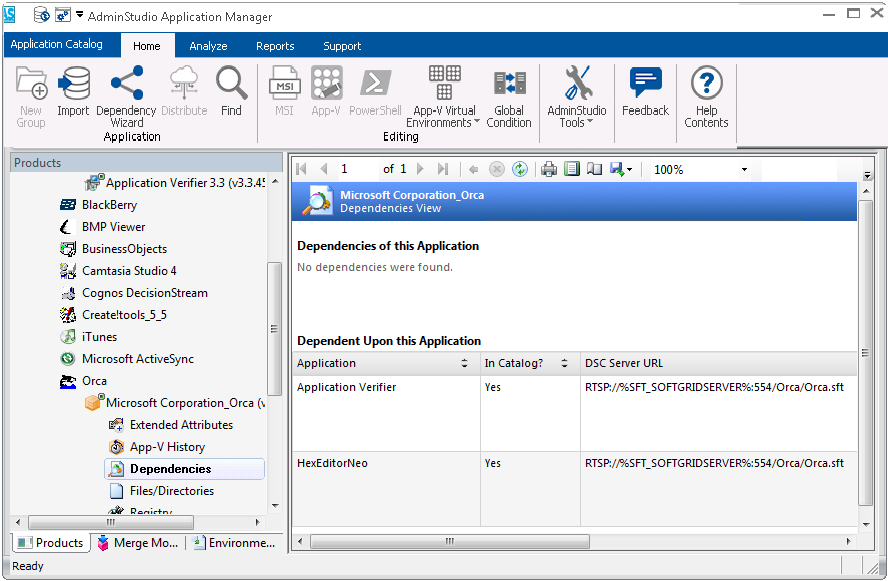 • This view lists both the applications this App-V package is dependent on and the applications dependent upon this App-V package. For each dependency, the following information is listed: