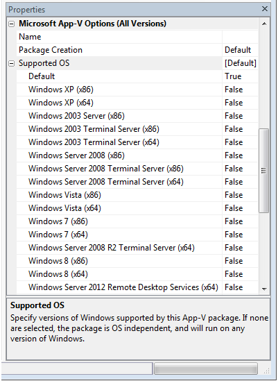 - In the Properties window, under Microsoft App-V Options (All Versions) , expand the Supported OS property to display the available operating systems.