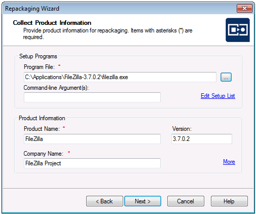 The Setup Programs area contains information about the setup you are repackaging. Repackager uses this information to launch the setup correctly following pre-analysis. The information collected includes: